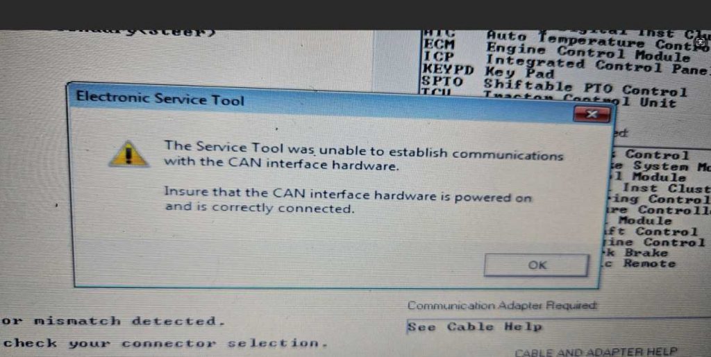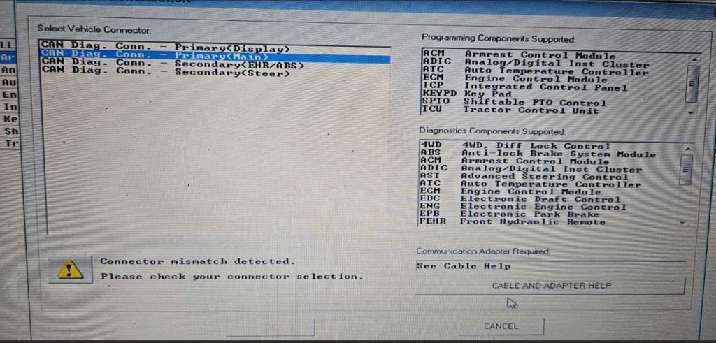 “I’m having trouble connecting my CNH EST service tool to my New Holland T7.315 tractor. It shows a connector mismatch error. I’ve attached pictures of the error screen, the adapter, and the cables I’m using.”