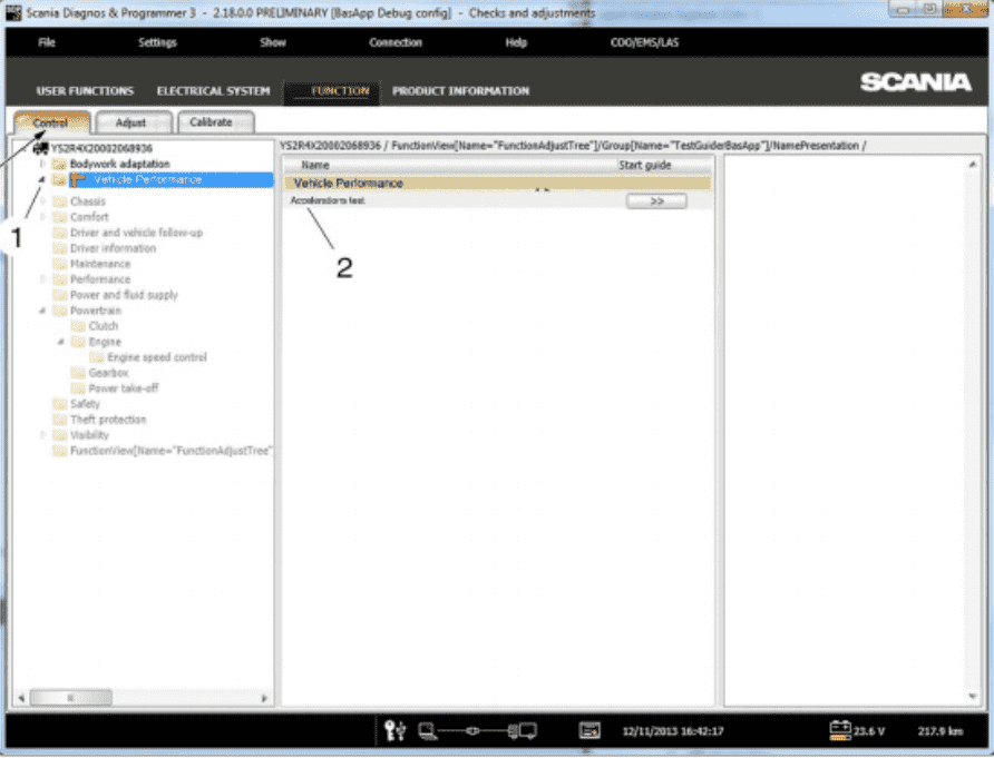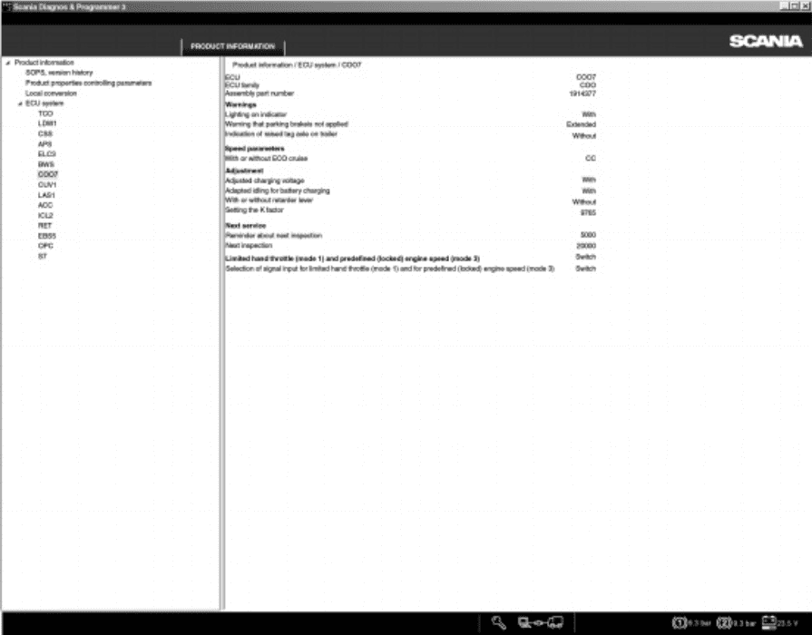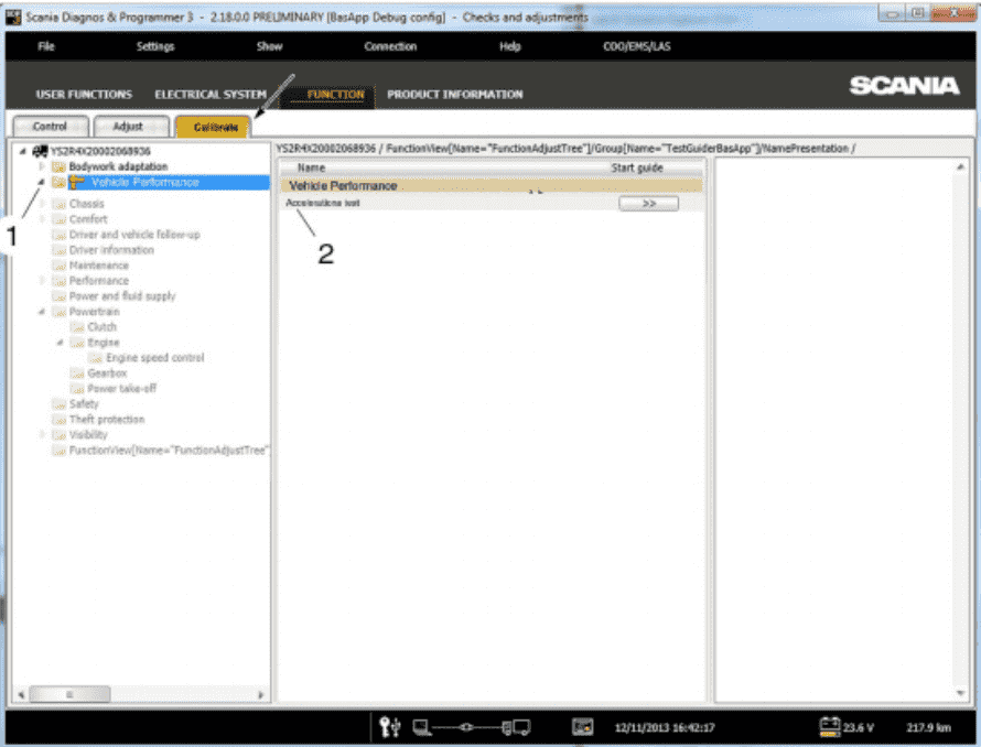 The Function View in SCANIA SDP3 allows you to check, adjust, and calibrate systems at a function level. When you switch between main tabs, SDP3 automatically navigates to the corresponding level in the new tab. Any modifications made at the function level are applied across all relevant control units simultaneously.
